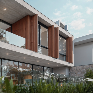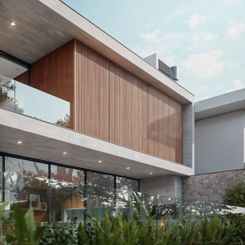 O terceiro nível, íntimo, é composto por um volume de concreto que repousa sobre o living, trazendo amplitude espacial com o pé direito duplo e criando um jogo de cheios e vazios com fenestrações em madeira e vidro.